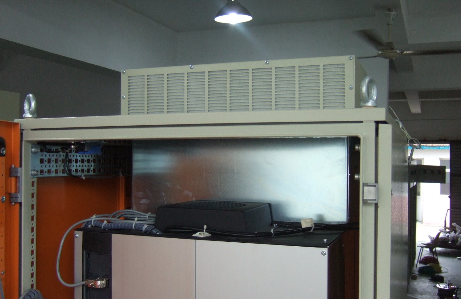 6、如果不用独立风道,请按照公式Q(m³/h)=3.1*P(w)/K(℃)计算,其中Q 是所需要的散热风量、P 是柜内总发热量、K 是温升(取值为45℃-最高环境温度),计算出Q 后,建议按照两倍的经验值来选择,因为柜内散热不是百分百的有效散热,特别是风扇有滤网时更要再放大。